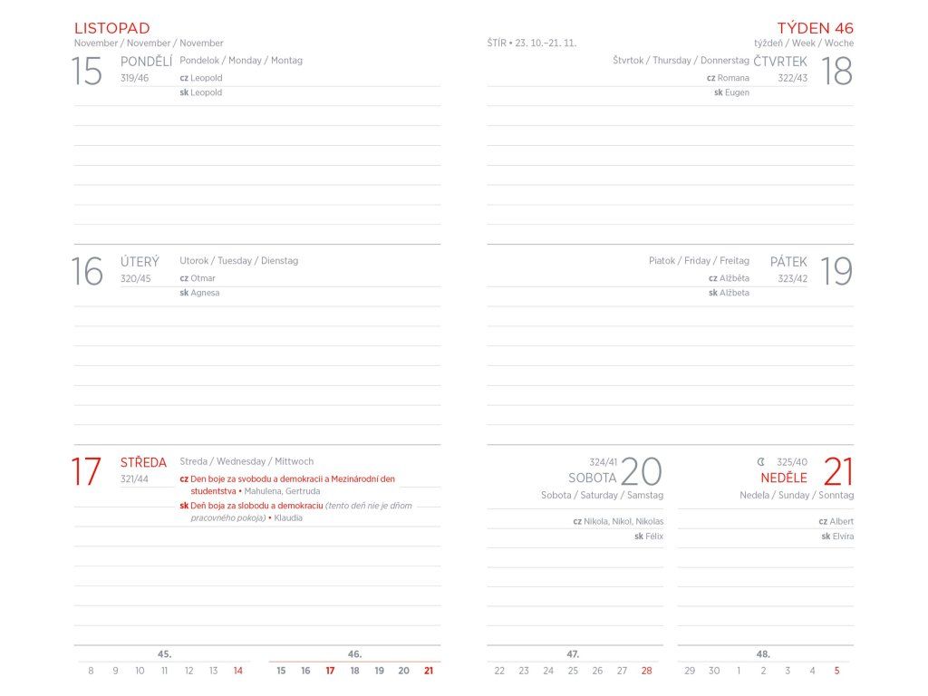 Uvnitř diáře najdete týdenní kalendárium, měsíční plánovač (dva měsíce na jedné straně), plánovací kalendář 2027, přehledný kalendář 2027 a 2028 a místo pro vaše poznámky.