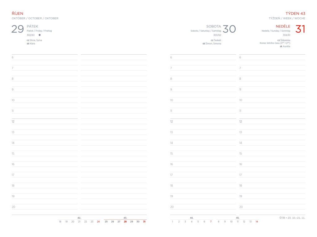 Uvnitř diáře naleznete denní kalendárium, měsíční plánovač na dvou stránkách, daňový kalendář, plánovací kalendář 2027 a místo pro vaše poznámky.