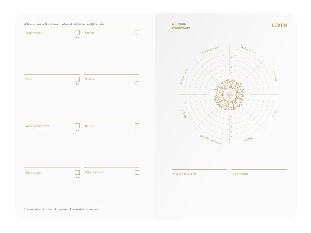 Každý měsíc se můžete ohlédnout za uplynulými týdny. Na jedné straně diáře se věnujete jednotlivým oblastem, jako jsou škola či práce, finance, zdraví, spánek, společenský život, rodina, čas pro sebe a seberealizace. Zde je prostor pro vaše poznámky, hodnocení a přemýšlení nad tím, co vám přineslo radost a co byste chtěli vylepšit.