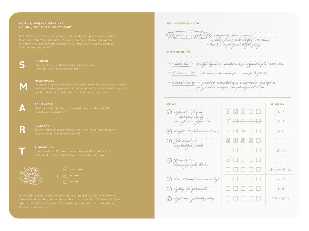 V tomto diáři najdete několik speciálně navržených stran, kde můžete strukturovaně a systematicky plánovat své cíle a definovat sny pomocí efektivní metody SMART.