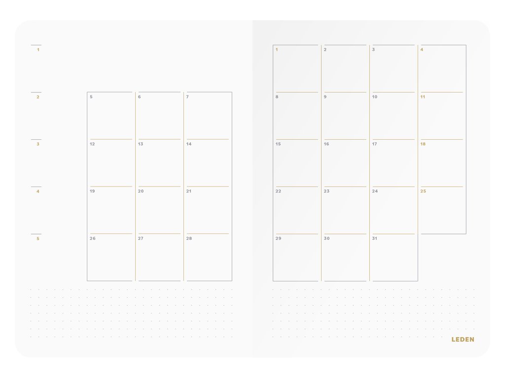 Měsíční plánovače nabízejí prostor pro vytvoření přehledu všech úkolů a aktivit pro daný měsíc. Můžete do nich zaznamenávat důležité termíny, schůzky, osobní a pracovní úkoly, projekty, zdravotní a fitness aktivity, návyky, které chcete sledovat, finance a jakékoli další důležité informace, které vám pomohou efektivněji řídit svůj čas.