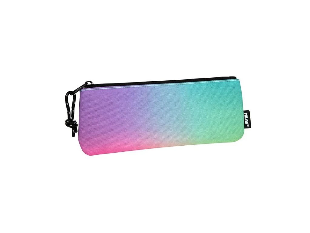 Malý plochý penál z kolekce MILAN Sunset, černý s přechodovými barvami inspirovanými západem slunce. Vnější tkanina RIPSTOP je lehká a odolná proti roztržení, složení 100 % polyester. Penál má kompaktní rozměry 23 × 9 × 1,5 cm, ideální pro uložení psacích potřeb a drobných školních předmětů.