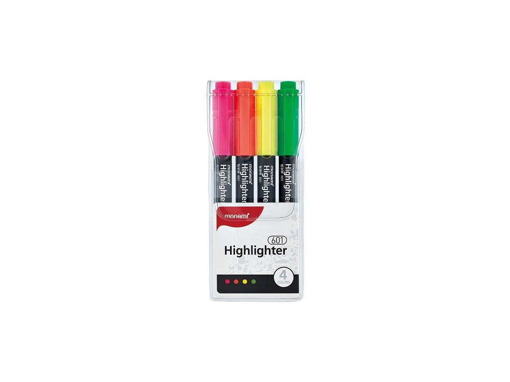 Sada 4 fluo zvýrazňovačů Monami Highlighter 601 se seříznutým hrotem o šíři stopy 1–4 mm. V balení jsou zářivé fluo odstíny žluté, růžové, oranžové a zelené. Zvýrazňovače mají kulaté černé tělo příjemné na dotek a víčko v barvě stopy s klipem, které zabraňuje skutálení. Inkoust zajišťuje rovnoměrnou a sytou stopu, která je stálá a nebledne. Ideální pro zvýrazňování, psaní i kreativní využití. Dodáváno v plastovém pouzdře.
