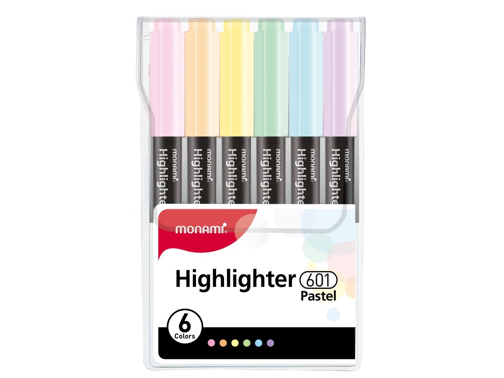 Sada 6 pastelových zvýrazňovačů Monami Highlighter 601 se seříznutým hrotem o šíři stopy 1–4 mm. Obsahuje jemné pastelové odstíny žluté, růžové, oranžové, zelené, modré a fialové. Zvýrazňovače mají kulaté černé tělo příjemné na dotek a víčko v barvě náplně s klipem, které zabraňuje skutálení. Inkoust poskytuje rovnoměrnou, sytou a stálou stopu, která nebledne. Vhodné pro zvýrazňování, psaní i kreativní využití. Balení obsahuje plastové pouzdro.