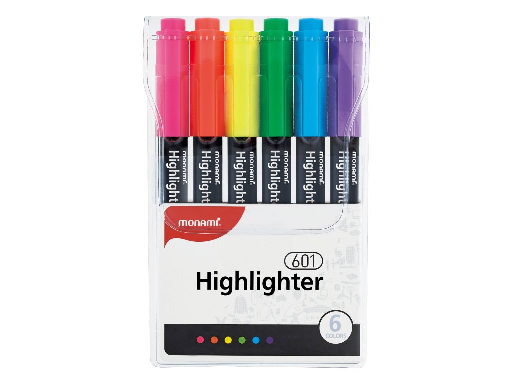 Sada 6 fluo zvýrazňovačů Monami Highlighter 601 se seříznutým hrotem o šíři stopy 1–4 mm. Obsahuje zářivé fluo odstíny žluté, růžové, oranžové, zelené, modré a fialové. Zvýrazňovače mají kulaté černé tělo příjemné na dotek a víčko v barvě stopy s klipem, které zabraňuje skutálení. Inkoust poskytuje rovnoměrnou, sytou a stálou stopu, která nebledne. Vhodné pro zvýrazňování, psaní i kreativní využití. Balení obsahuje plastové pouzdro.