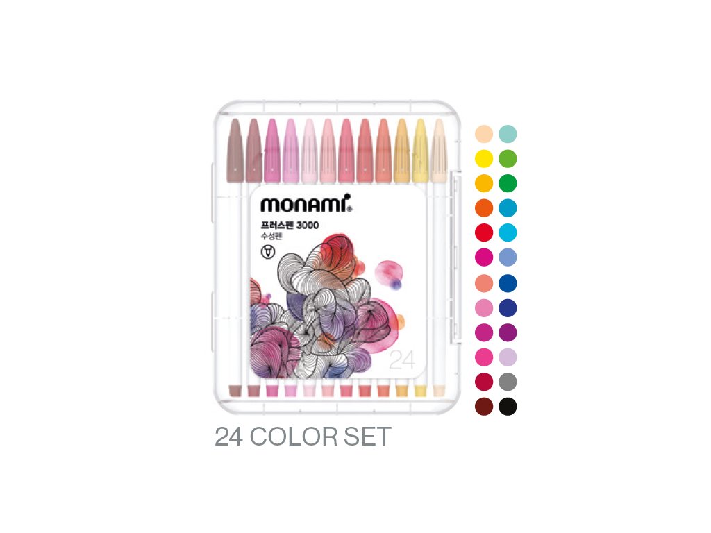 Sada 24 barevných popisovačů Monami Plus Pen 3000 s tenkým flexibilním hrotem o šíři stopy 0,4 mm. Hrot se přizpůsobí přítlaku, umožňuje tenké i silnější linie a je vhodný pro kaligrafii či techniku brushpen. Plastové štíhlé a kompaktní tělo s víčkem padne pohodlně do ruky. Popisovače používají vodou ředitelný inkoust, který lze rozmývat a snadno vyprat, vhodné pro psaní, kresbu i zdobení. Barva těla odpovídá barvě náplně. Balení obsahuje 24 zářivých barev v praktické transparentní krabičce pro uložení a přepravu.