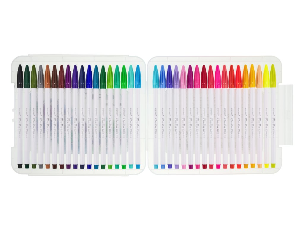 Sada 36 barevných popisovačů Monami Plus Pen 3000 s tenkým flexibilním hrotem o šíři stopy 0,4 mm. Hrot se přizpůsobí přítlaku, umožňuje tenké i silnější linie a je vhodný pro kaligrafii či techniku brushpen. Plastové štíhlé a kompaktní tělo s víčkem padne pohodlně do ruky. Popisovače používají vodou ředitelný inkoust, který lze rozmývat a snadno vyprat, vhodné pro psaní, kresbu i zdobení. Barva těla odpovídá barvě náplně. Balení obsahuje 24 zářivých barev v praktické transparentní krabičce pro uložení a přepravu.