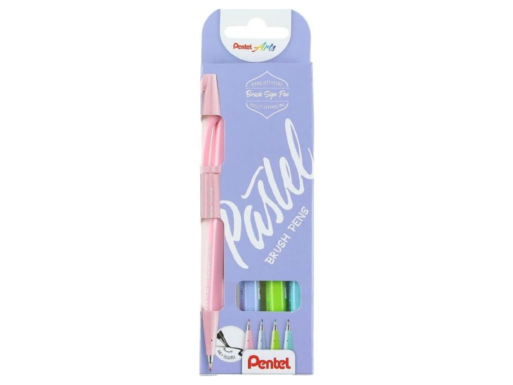 Sada 4 štětečkových popisovačů Pentel Sign Pen v pastelových barvách se štětečkovým hrotem v kovové objímce (brushpen). Flexibilní vlákna hrotu umožňují proměnnou šířku stopy od extra jemné po středně širokou podle přítlaku. Hrot se vždy vrátí do původního tvaru, vhodné pro začátečníky i pokročilé. Popisovače jsou ideální pro kaligrafii, handlettering, krasopsaní, kresbu, ilustrace a lineart. Inkoust na vodní bázi je rozmývatelný vodou, umožňuje blendování a tvorbu ombré efektů.