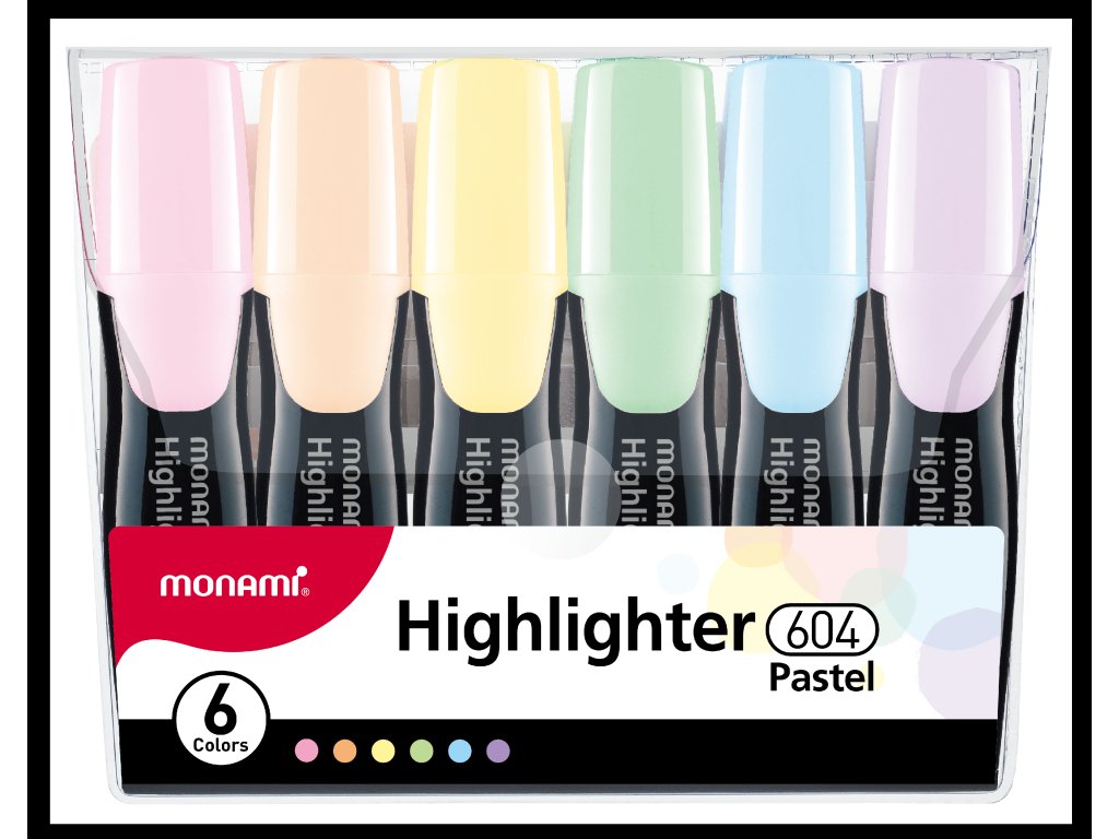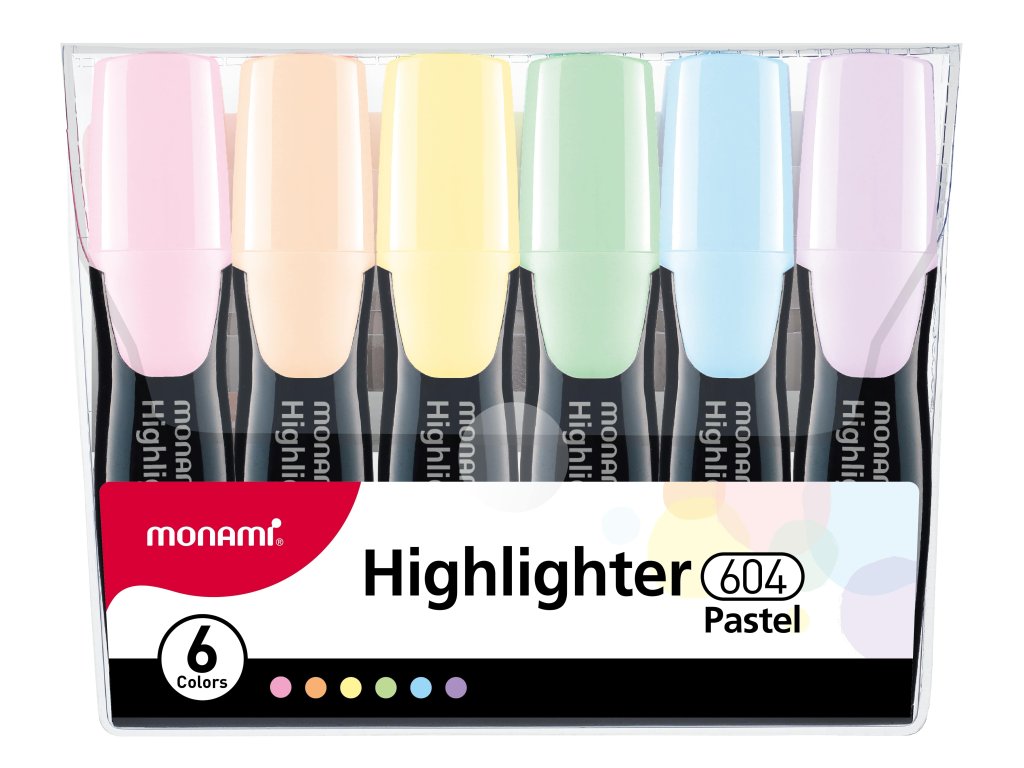 Sada 6 pastelových zvýrazňovačů Monami Highlighter 604 s plochým ergonomickým tělem a seříznutým hrotem o šíři stopy 1–4 mm. Obsahuje pastelové odstíny žluté, růžové, oranžové, zelené, modré a fialové. Zvýrazňovače mají rovnoměrnou, sytou a stálou stopu, která nebledne. Plochý ergonomický design černého těla je příjemný na dotek a víčko v barvě náplně má klip, který zabraňuje skutálení. Balení obsahuje plastové pouzdro. Ideální pro značení, zvýrazňování a kreativní využití.